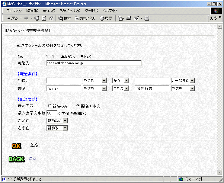 メールを転送する携帯電話、PHSでのメールアドレスを指定します。